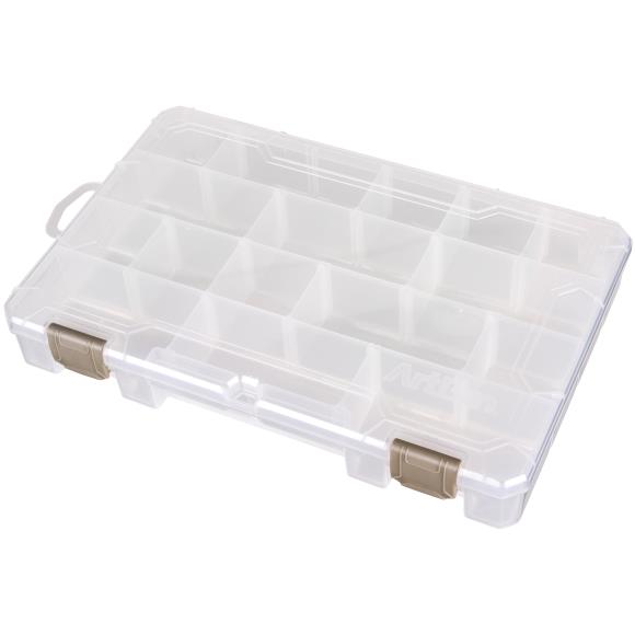 This versatile storage organizer is great for scrapbooking, crafts, art supplies, home office, and more. It is made of clear plastic and includes optional dividers for customizing the space to fit your needs. Inside are four permanent compartments each measuring 6-1/4×1-1/2 inches. Along each of the walls are slots spaced 1-1/8 inch apart for inserting any or all of the twelve included dividers. Two ‘no-spill’ latches keep the hinged lid tightly and securely closed. Outer dimensions of the organizer are 10-3/4×7-3/8×1-3/4 inches. This package contains one storage organizer and twelve dividers.