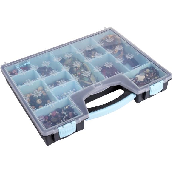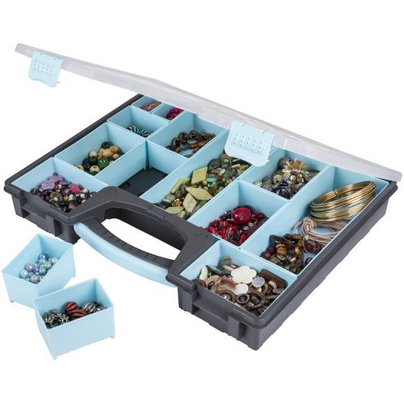 Perfect for storing all of your small craft supplies! This package contains one 16.5×12.5×2.25 inch storage tote with 12 removable bins and one carry handle.