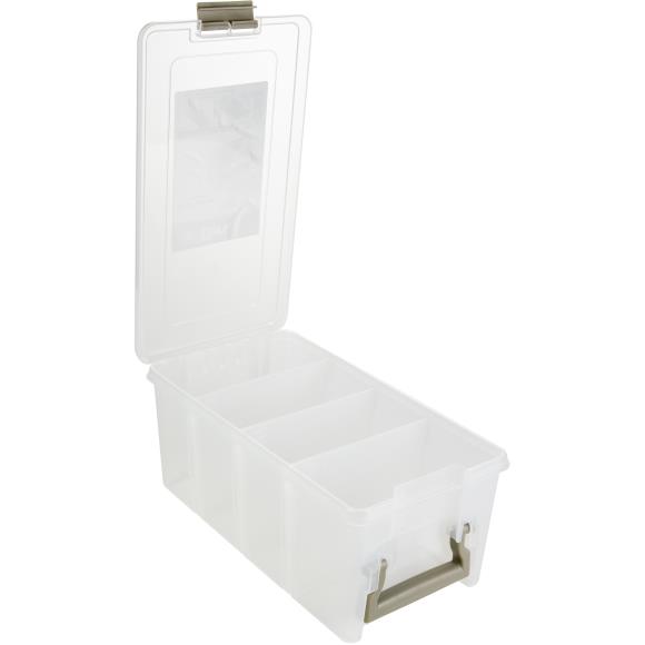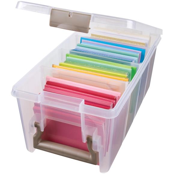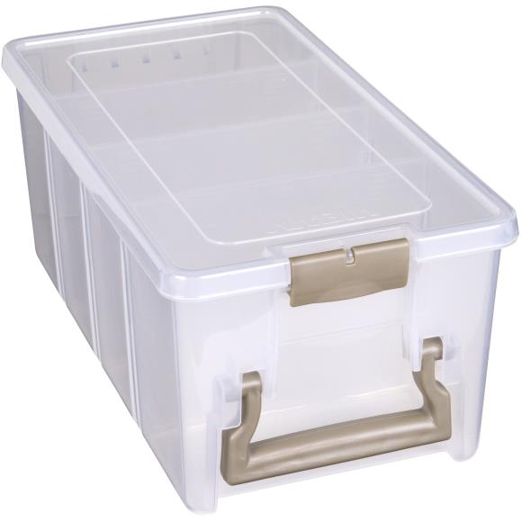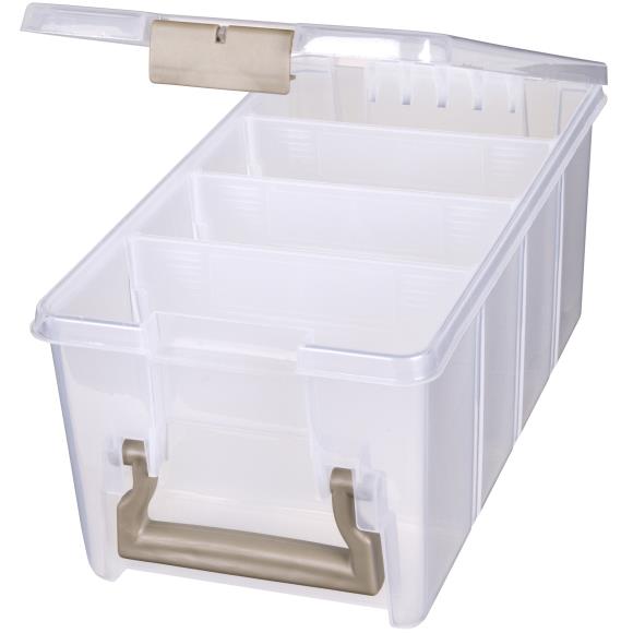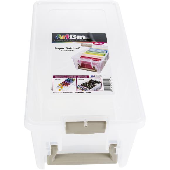 6925AB ArtBin Super SEMI Satchel Translucent,A plastic storage container perfect for crafters of all kinds! Excellent for storing cardstock, pre-cut fabrics, punches, jars, paint tubes and more. This 15.25x8x6.5 inch package contains one storage bin (inner dimension of 13.5×7.25×6) and three removable dividers inside to customize the space.