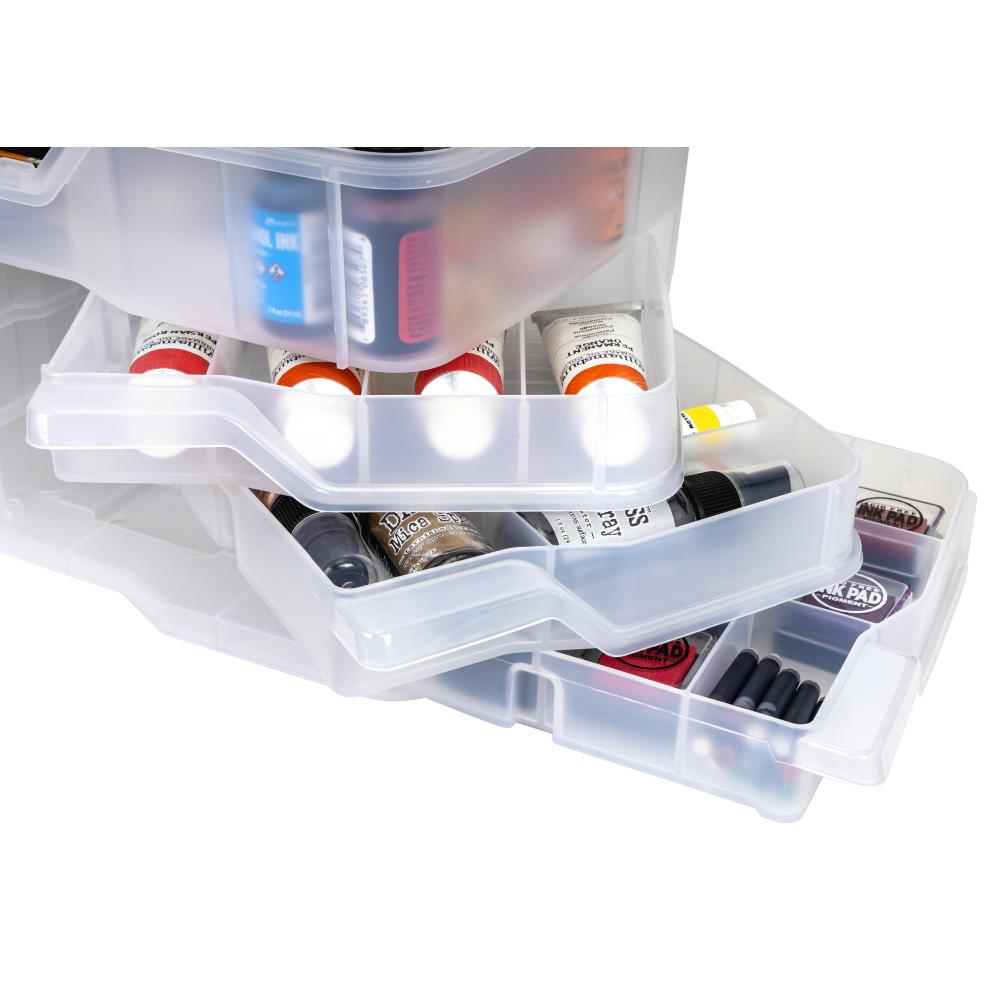 Art Bins new translucent Project Boxes are not only an attractive addition to the ArtBin line, but also feature an innovative locking mechanism and swing-out drawers. The drawers are self-locking and easily swing out giving you complete access to their content and keeping everything in its place right where you left it. The boxes come in two sizes, the medium has 4 drawers and the large has six. They are made with a frosted-translucent plastic and feature a large, light blue dial-style latch and matching light blue ergonomic handle. This package contains a large project box. Available in a variety of sizes. Each sold separately.