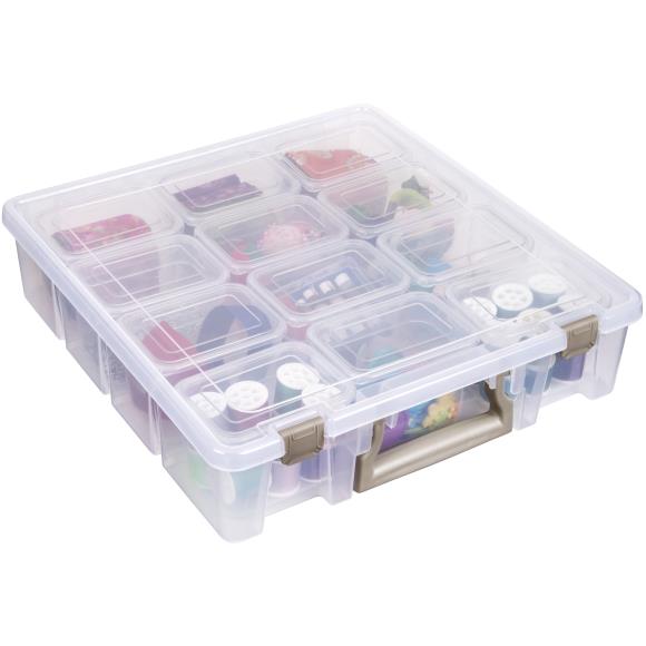 6965AH ArtBin Super Satchel W/12 Storage BinsPerfect for storing all of your tools and small supplies! The clear color of the bins make it easy to always know exactly where things are. This package contains one 15.25x14x3.5 inch tote with 12 small bins with lids. Made in USA.Package Dimensions