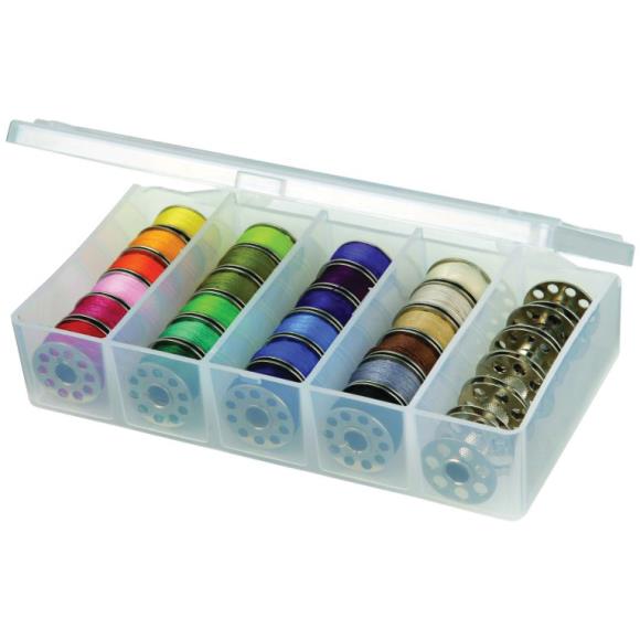 ART BIN-Bobbin Box is ideal for storing all your bobbins or other small sewing notions. This clear plastic box stores up to 30 bobbins and securely closes with a snap lid. Measures: 3 x 6 x 1.25 inches.