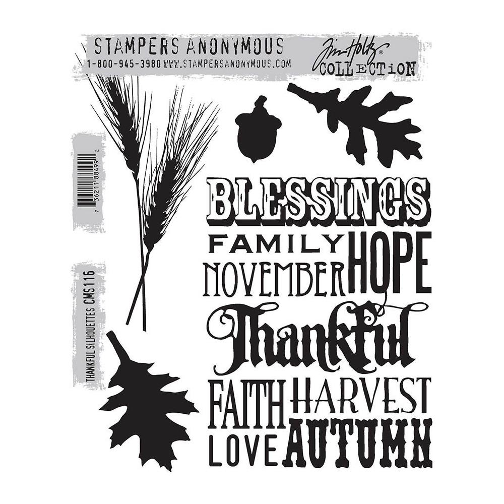 CMS116 Tim Holtz Cling Rubber Stamp Thankful Silhouettes. Stampers Anonymous-Tim Holtz Cling Rubber Stamps. These red rubber stamps come mounted on cling foam so you can use them with any acrylic block (sold separately). Great for using with Tim’s signature distressing techniques! Stamps come on a 3-hole punched sheet for easy storage in the Tim Holtz Stamp Storage Binder (also sold separately). This package contains one 8-1/2×7 inch sheet of stamps. Comes in a variety of designs.