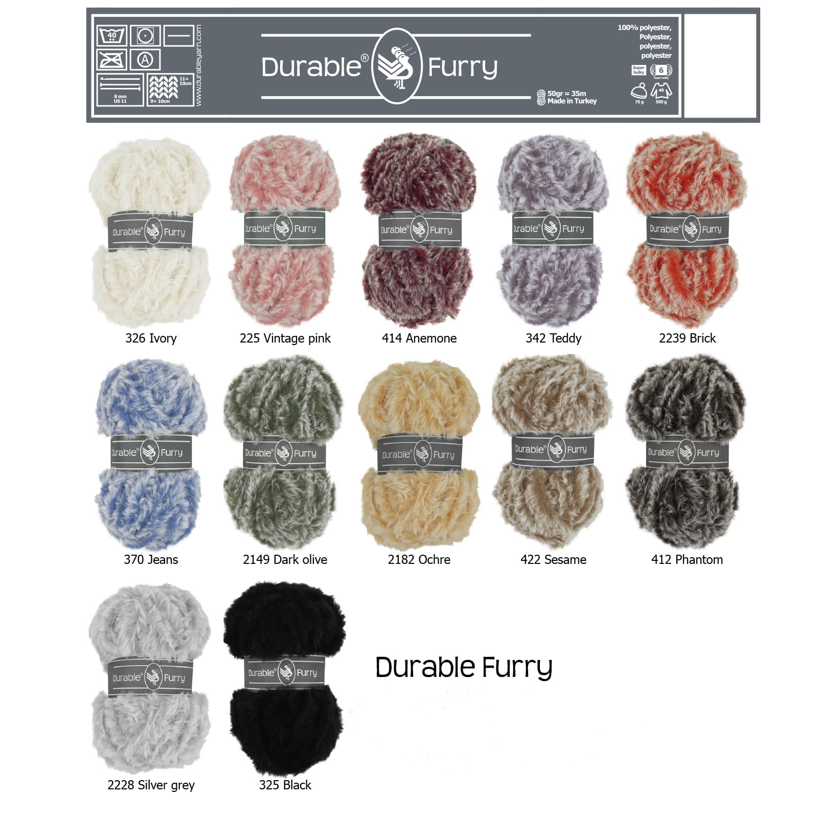 Dit garen, gemaakt van 100% polyester, is perfect voor het creëren van zachte vesten, knuffels, accessoires en decoraties. De weelderige zachtheid en volumineuze textuur maken Furry ideaal voor projecten waar comfort en stijl samenkomen. Bovendien is het garen eenvoudig wasbaar, waardoor het zowel praktisch als elegant is. Met een bolgewicht van 50 gram, waarbij 2 bollen voldoende zijn voor een loopsjaal, biedt Furry een snelle en gemakkelijke manier om prachtige projecten te realiseren. Geniet van de pluizige elegantie van Durable Furry!