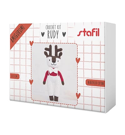 Dit haakpakket bevat de benodigdheden om Rudy te haken. Rudy is een knap rendier wat uiterst netjes gekleed is, met een witte broek, rood shirt en vlinderstrik. Gehaakt met een haaknaald 2,5 wordt Rudy ongeveer 25cm.