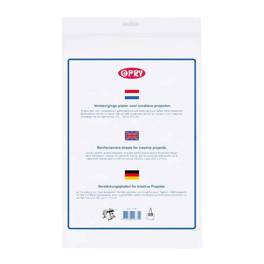 Deze vellen verstevigingsplaat van Opry zijn voor allerlei creatieve doeleinden te gebruiken. Zo zijn ze ideaal voor het zelf maken van – herbruikbare – tamponneersjablonen, kleine patroondelen, quiltsjablonen of patchworktemplates. Het materiaal is zeer stevig en is in te naaien met de naaimachine – daarmee is het uitstekend bruikbaar als versteviging voor bijvoorbeeld tasbodems.