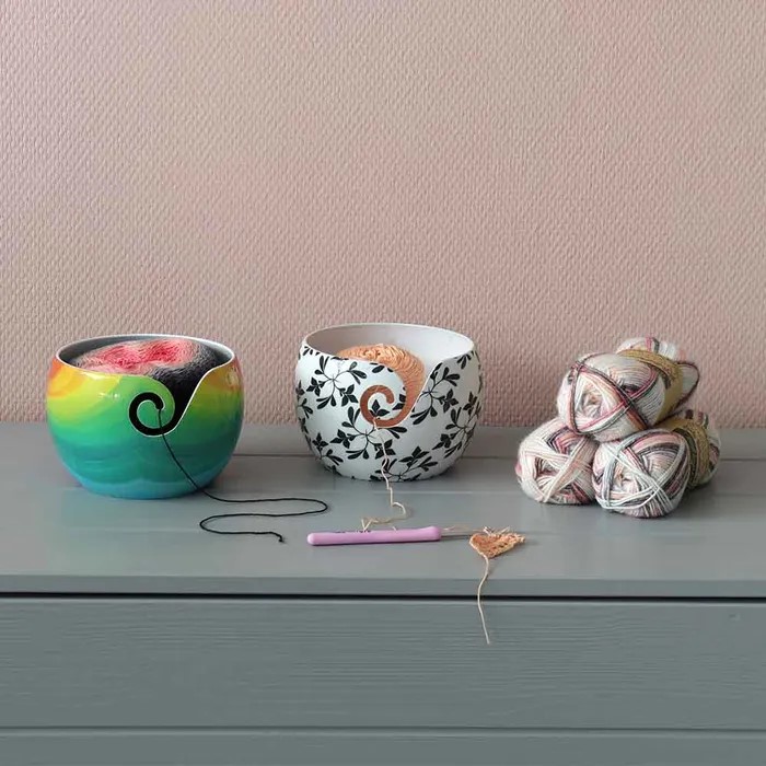 Iedereen die wel eens een bol garen achterna heeft moeten rennen, weet hoe fijn een yarn bowl is. Plaats je bol garen in de schaal en leid de draad door de spiraalvormige opening. Zo blijft je garen netjes op zijn plek terwijl jij ongestoord verder kunt haken of breien.