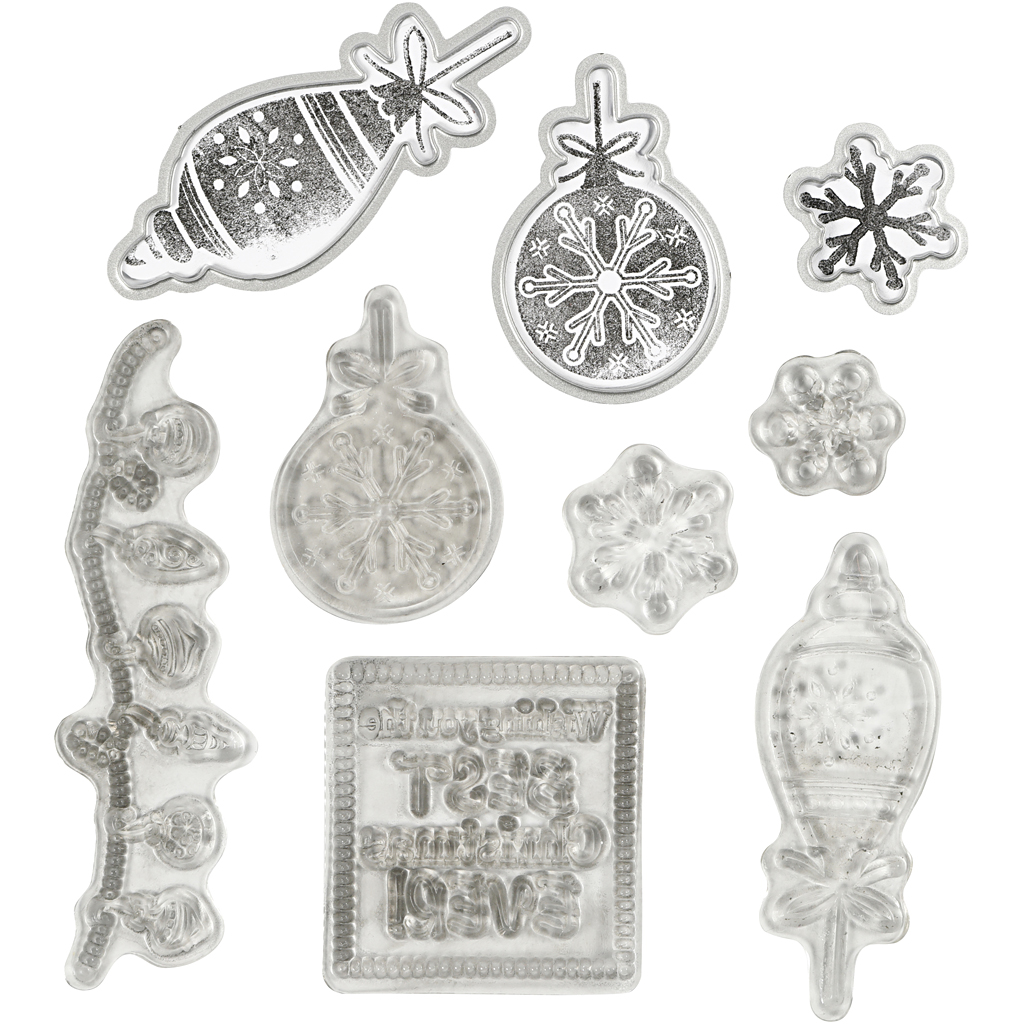 Set silicone stempels die gecombineerd kunnen worden met de meegeleverde snijmallen en embossingfolders. Voor het stansen van karton, papier enz. Gebruik hiervoor de stans- en embossingmachine artikelnrs. 11761, 11792 en 11799.