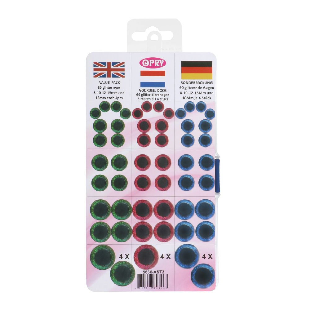 Veiligheidsoogjes Glitter 8 – 18 mm Assorti zijn natuurgetrouw en bevat 60 glitter ogen verdeeld over 5 maten (4 stuks per maat), in 3 verschillende kleuren.